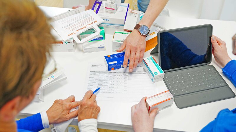2. Bringen Sie dazu Ihren Medikationsplan oder sowie alle Medikamente und Nahrungsergänzungsmittel mit, die Sie einnehmen. Kühlartikel und Betäubungsmittel können Sie zu Hause lassen, sollten aber auf einem Zettel oder dem Medikationsplan (mit Dosierung und Verfall) vermerkt werden.